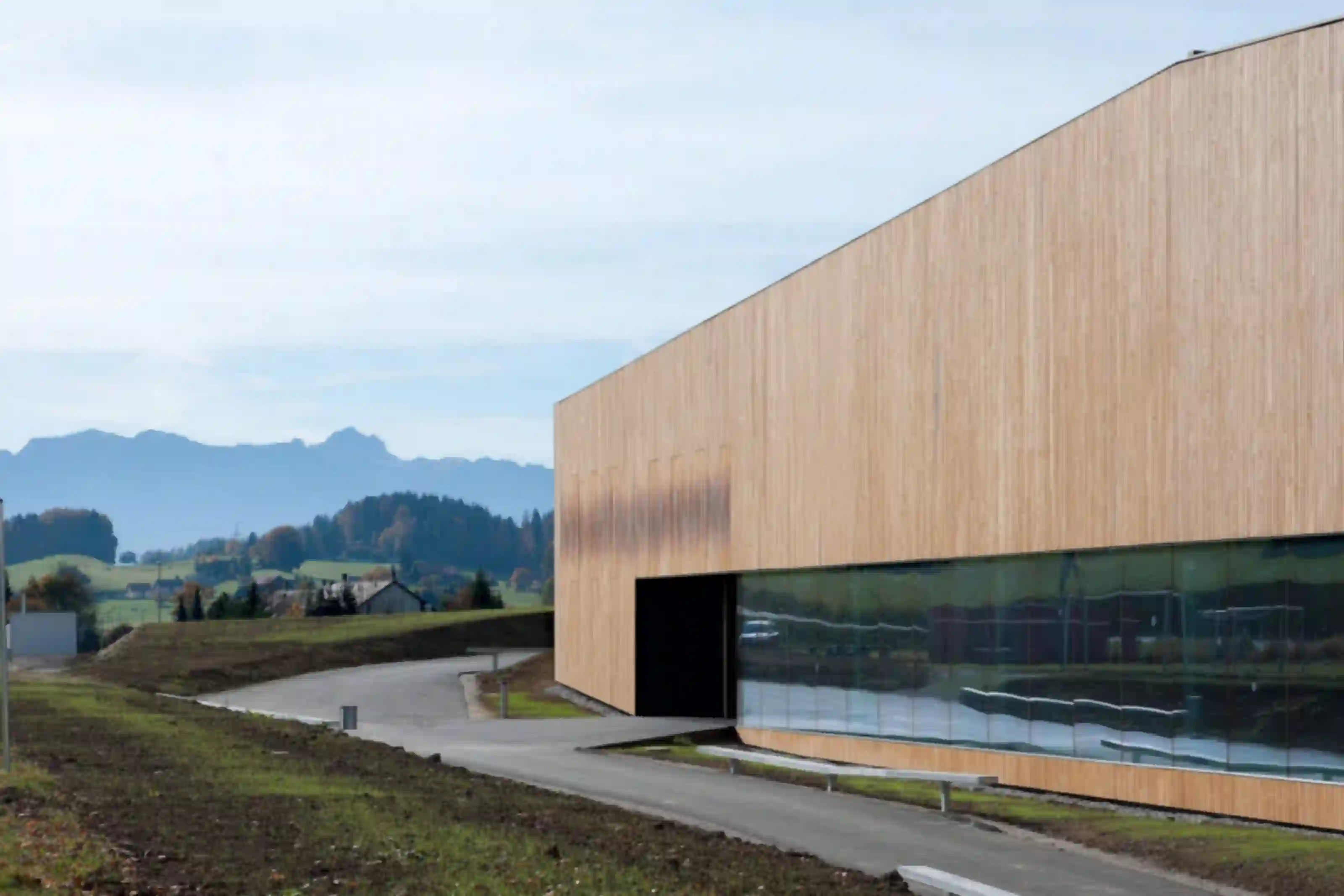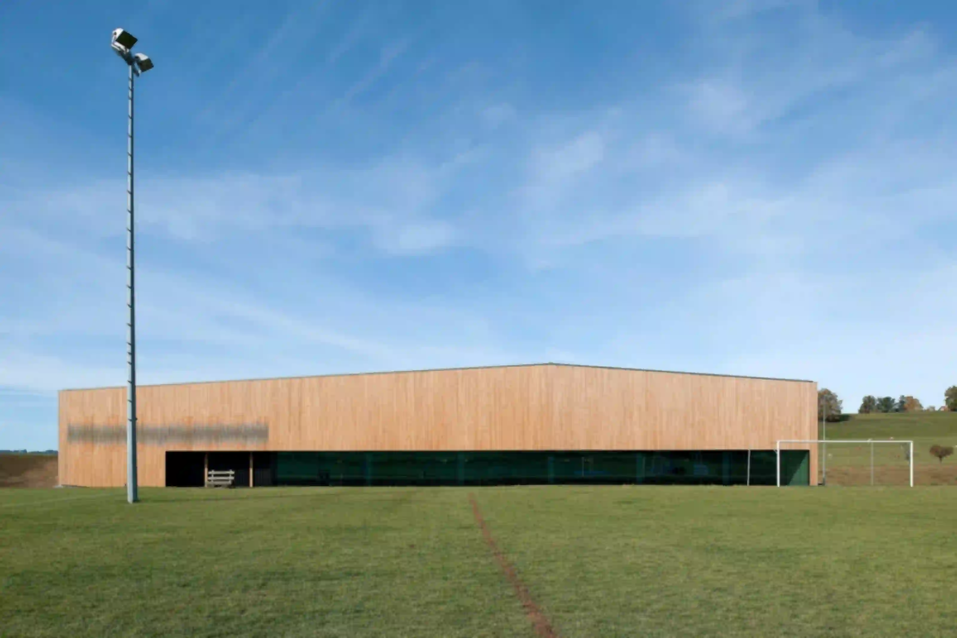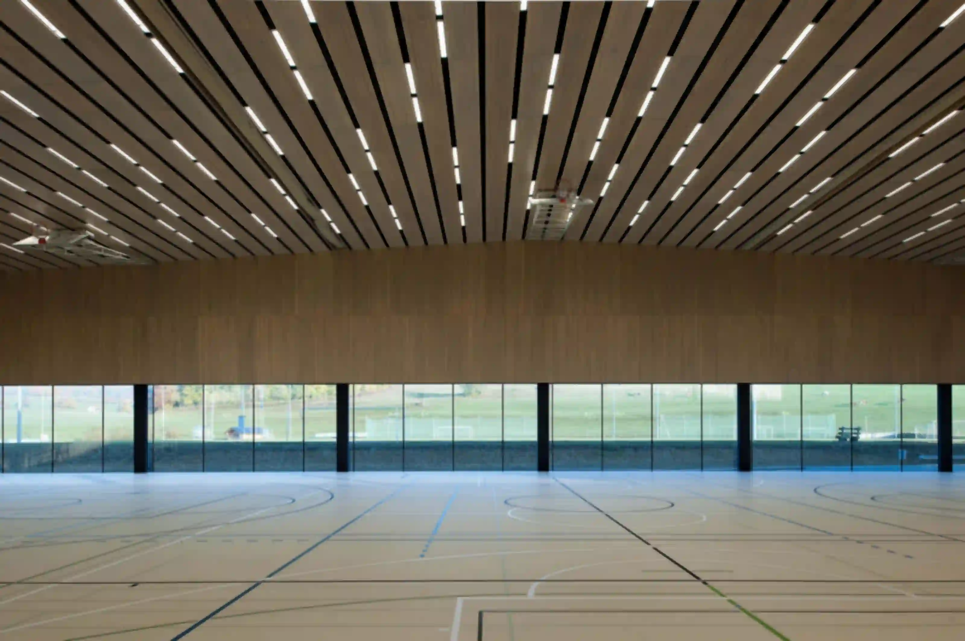 C’est dans un environnement paysager vallonné, au pied des Préalpes, que vient s’implanter sur une butte existante la nouvelle salle de sport triple de Châtel-St-Denis. Entre champs et prairies se confond dans le paysage la construction caractérisée par deux longs pans de toiture faiblement inclinés. La salle est réalisée essentiellement en charpente bois, qu’il s’agisse de la structure de la toiture, des façades ou du bardage extérieur. Le traitement des façades, leur matérialisation et l’exécution des détails confèrent au nouveau bâtiment un caractère unique.