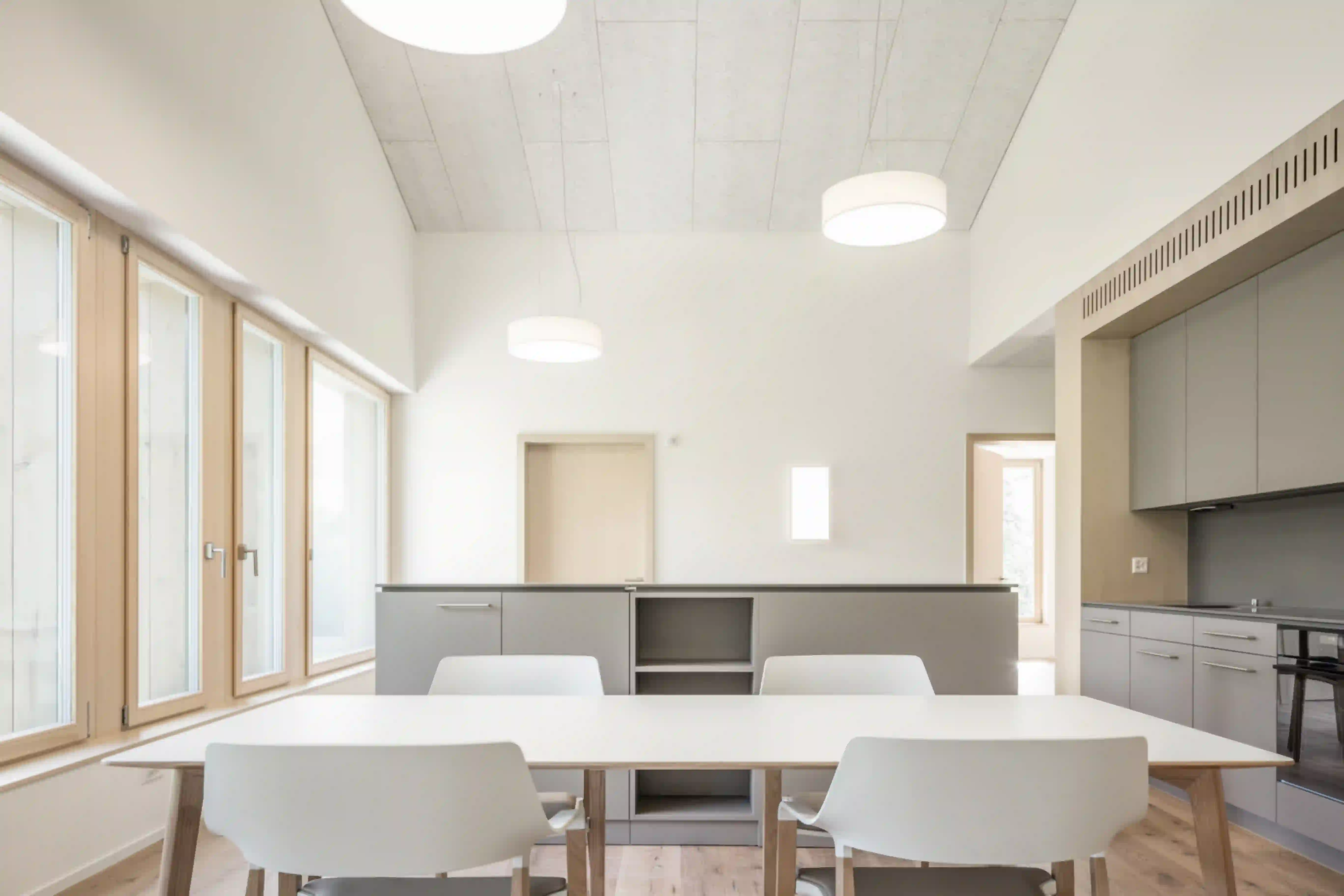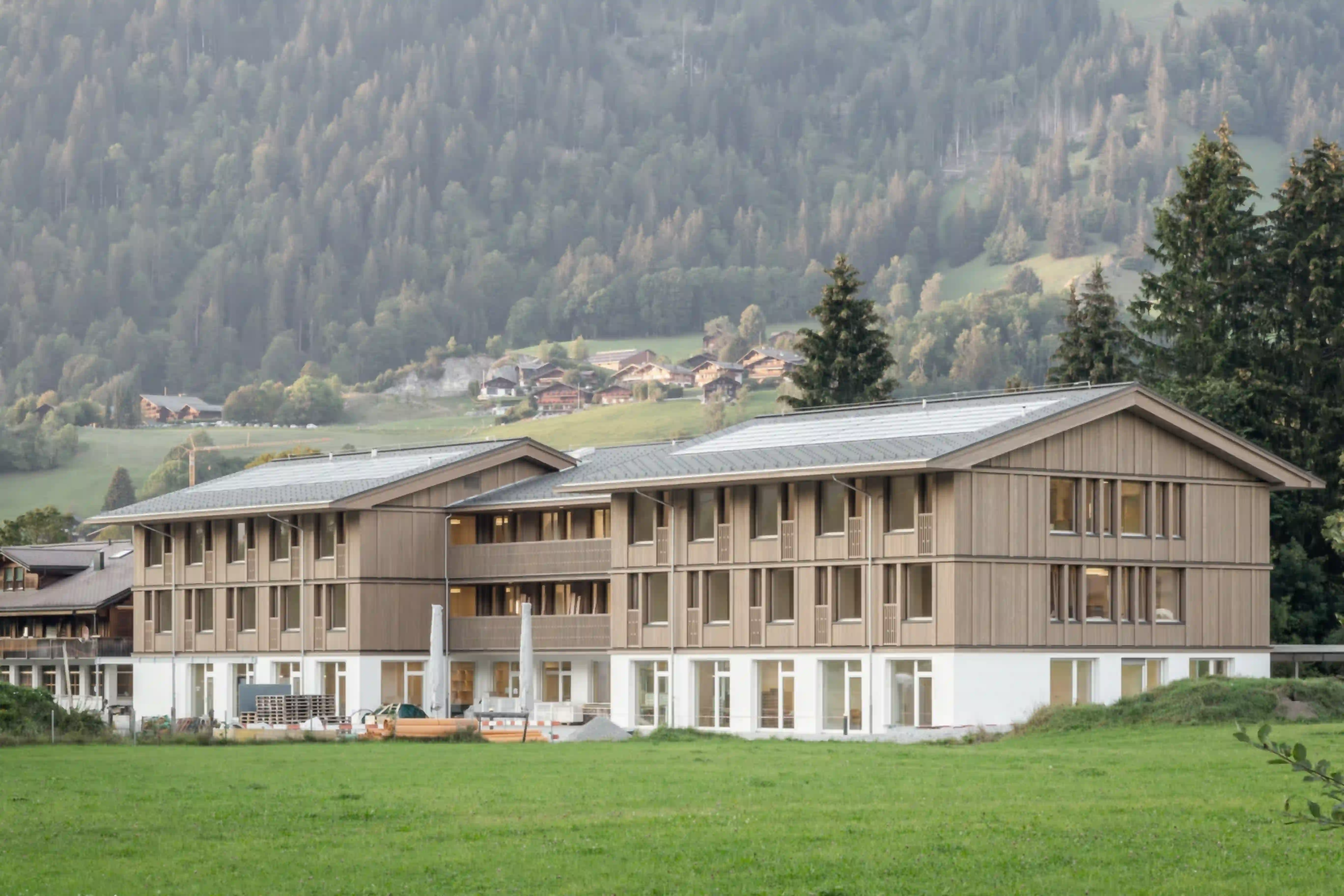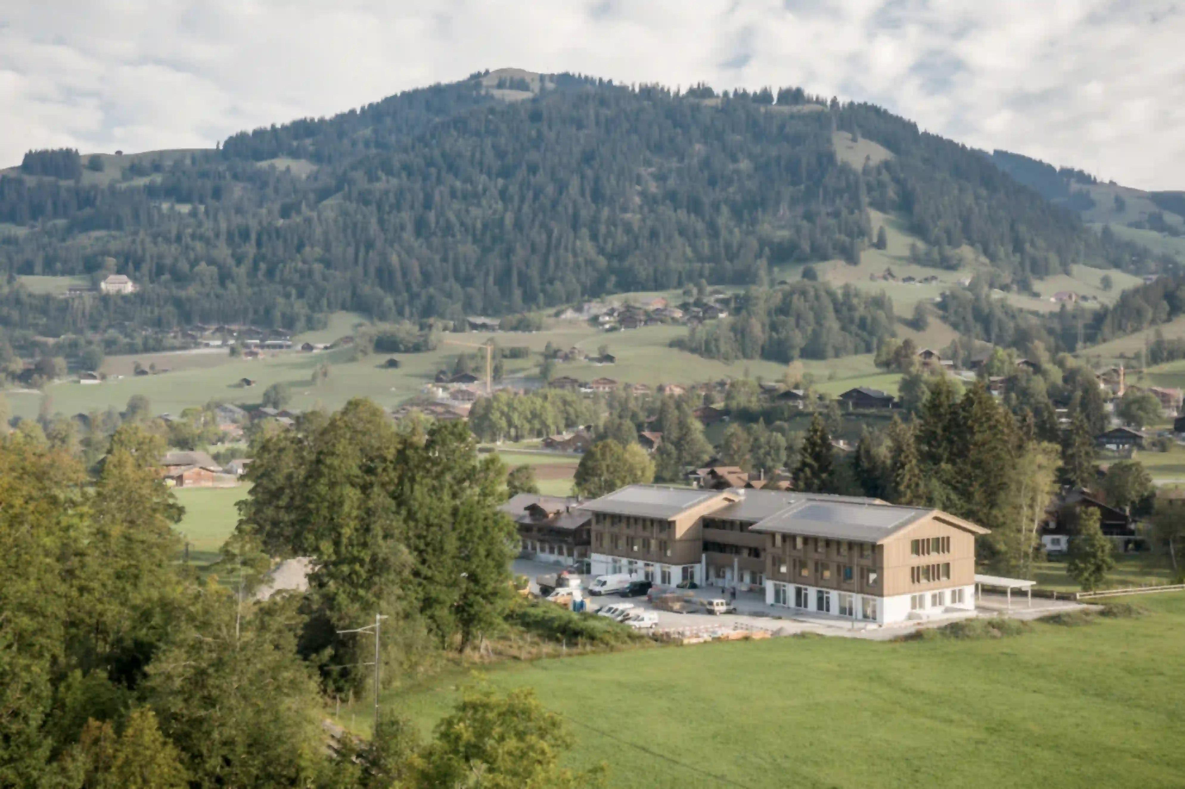La Fondation Alpenruhe, lieu de vie et de travail, est une institution qui prend en charge, assure les soins et vient en aide aux personnes affectées par un handicap psychique résidant dans le Saanenland. De plus, sa boutique et son zoo en font également depuis longtemps une destination de loisirs très appréciée par les familles et les visiteurs de la région. La réorganisation du complexe offre plus d'espace aux rencontres et faciliter les contacts avec les visiteurs, tout en garantissant aux résidents suffisamment d'intimité et de zones privatives. Le nouveau bâtiment accueille entre autre le foyer et le café ouvert au public au sein d’un volume articulé sur 3 étages. Une partie en saillie au nord sépare les zones d’entrée et de livraison, alors qu’au sud, un retrait de la façade permet de créer une terrasse protégée. Le rez-de-chaussée est dédié à la vie communautaire des utilisateurs, tandis que les étages supérieurs accueillent des groupes résidentiels individuels. Le crépi, le bois et la pierre sont autant de matériaux qui confèrent aux espaces de vie un cadre naturel et agréable. Une interprétation contemporaine de la construction traditionnelle du Saanenland se traduit entre autre par l’expression d’un socle en façade et de la toiture à deux pans.