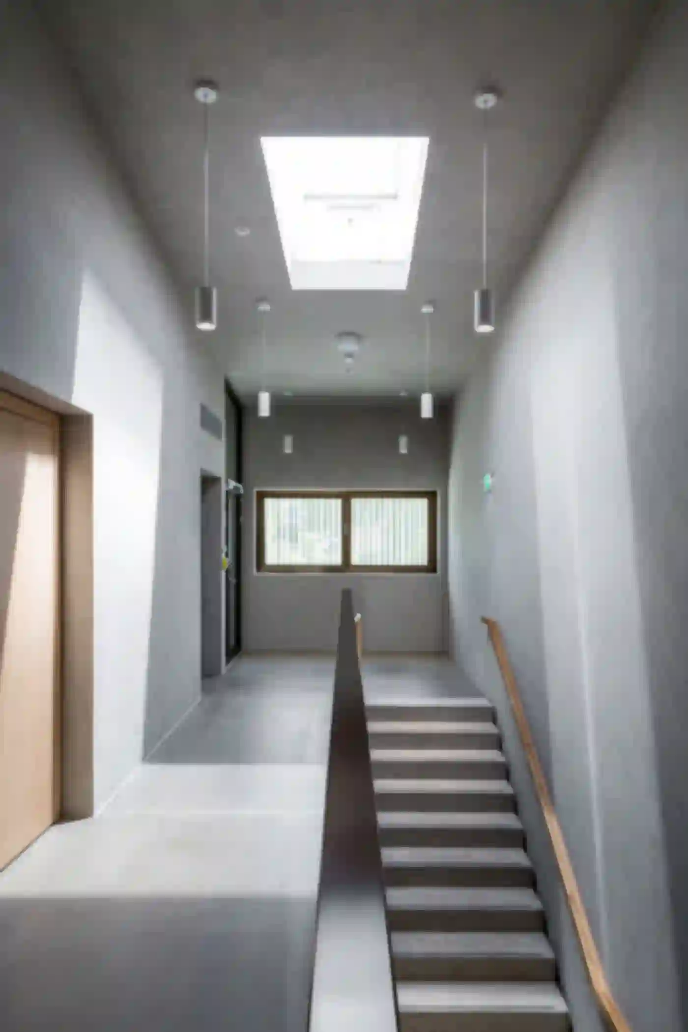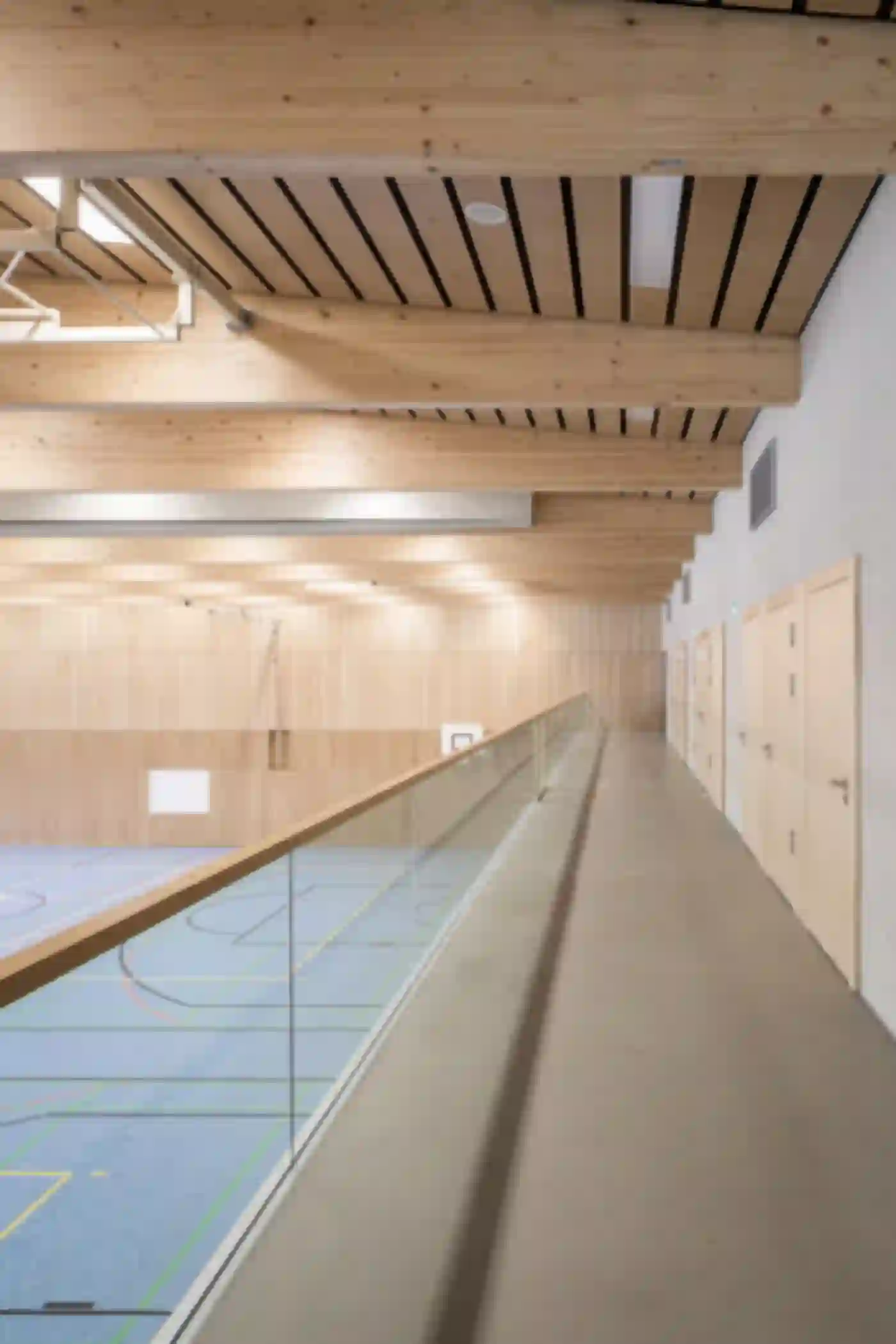 La nouvelle salle de sport double vient remplacer la salle de sport préexistante de l’ensemble scolaire de Niederviehbach. Le projet se glisse sur la parcelle entre les bâtiments découpés de l’école actuelle et ceux de l’école enfantine. Il se présente alors comme un volume indépendant mais étroitement lié au complexe scolaire existant. Le site bénéficie dorénavant d’un foyer commun, dont la fonction est double ; d’une part délimiter un seuil entre quartier et école, avec à l’est l’accès principal et à l’ouest l’accès au préau, et d’autre part relier l'école à la nouvelle salle de sport. La salle de sport en elle-même présente une organisation simple et compacte grâce notamment à la répartition des locaux secondaires sur deux niveaux. Un bardage doré en aluminium habille les façades alors qu’à l’intérieur le béton apparent, du bois clair et des couleurs discrètes dominent.