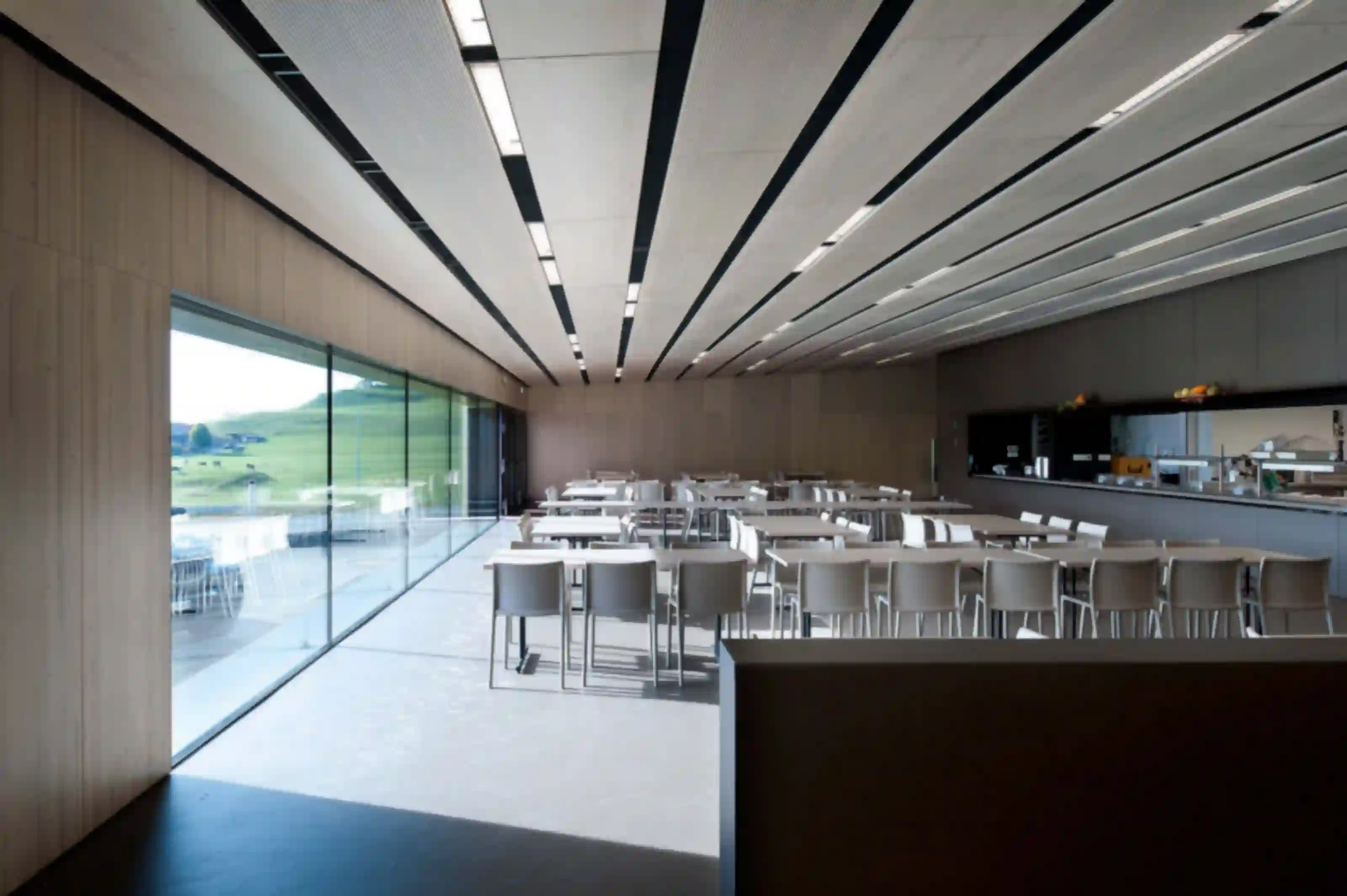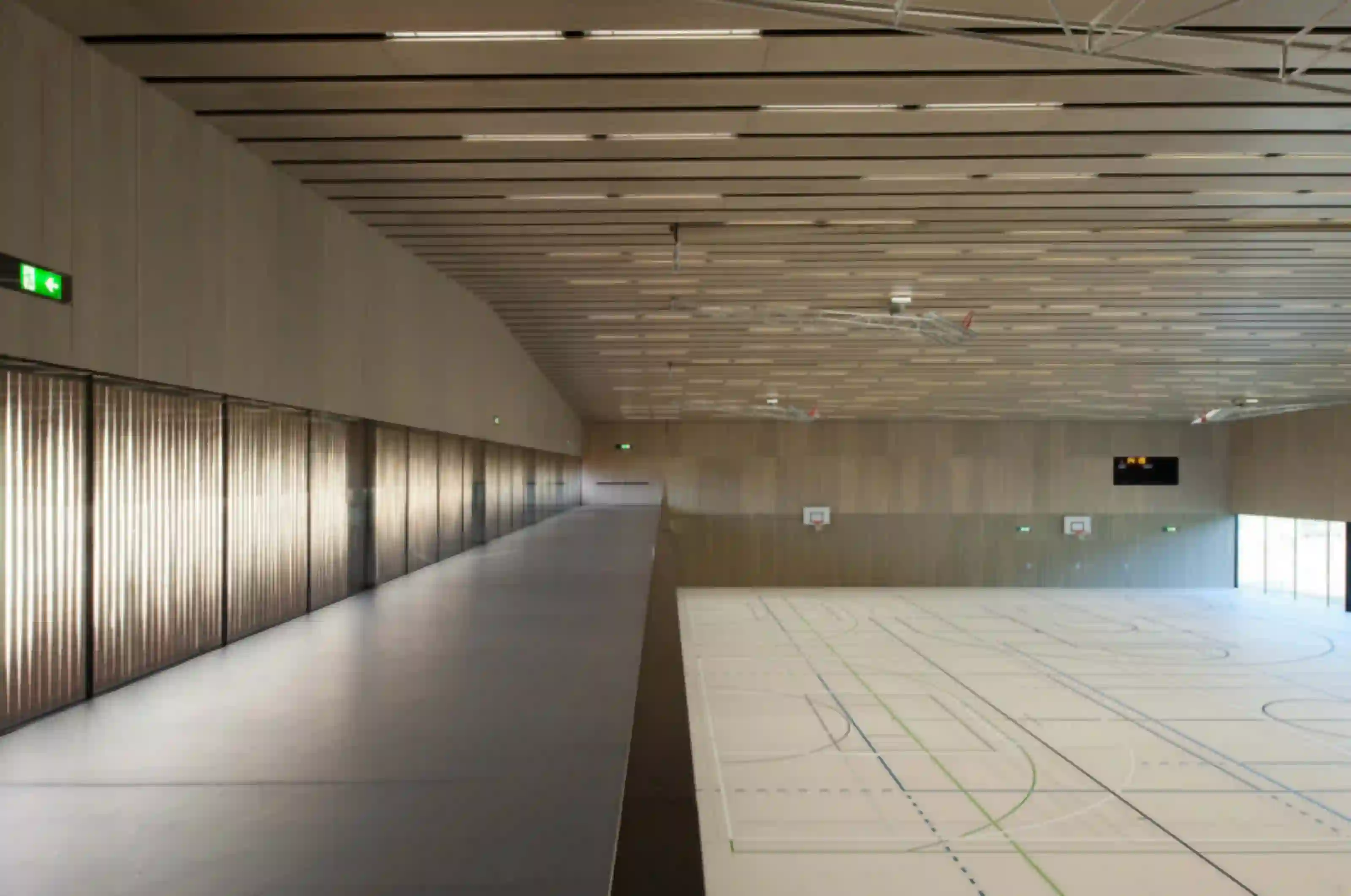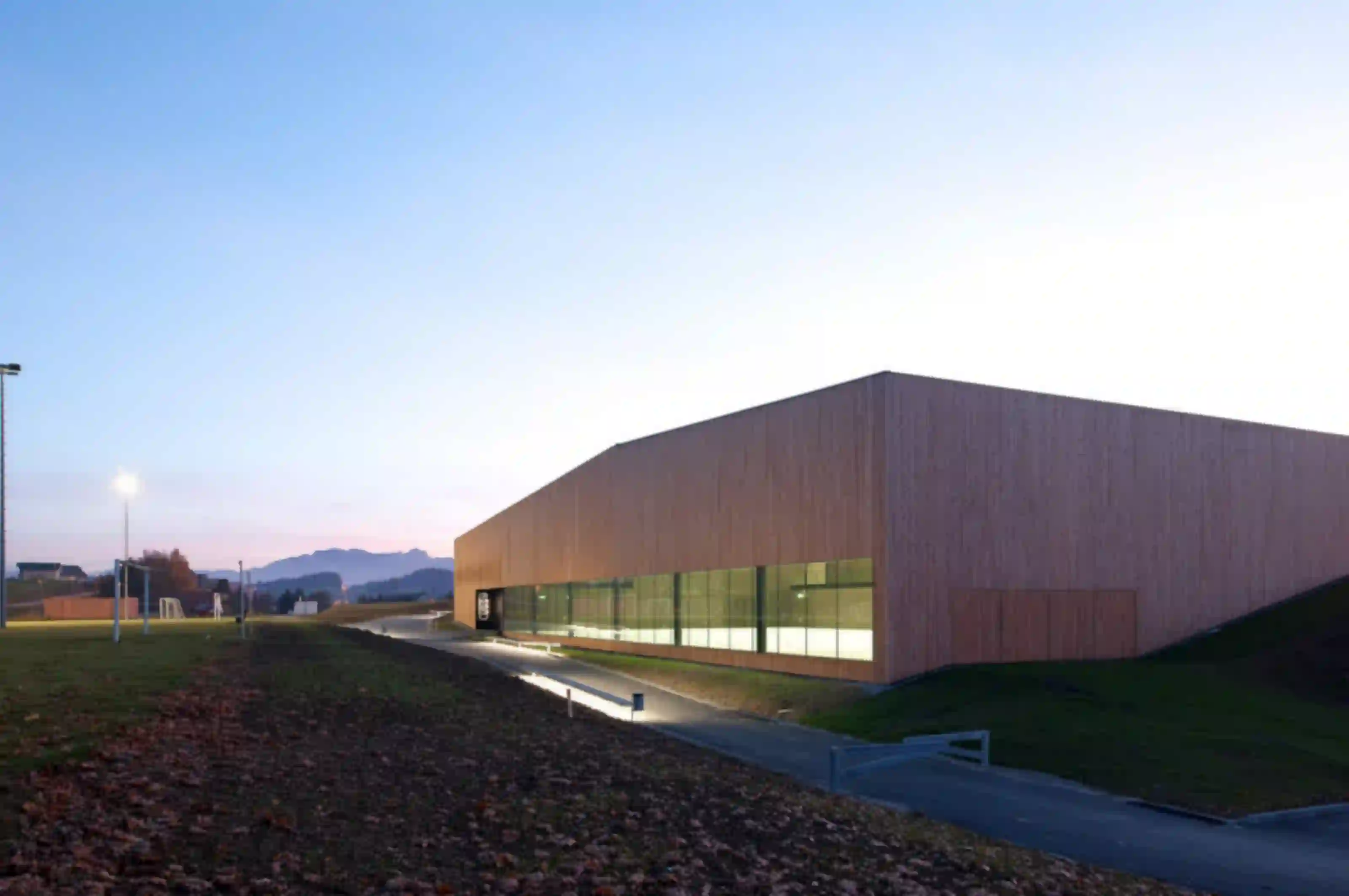 Der Ortsrand von Châtel-St-Denis verläuft sanft in die Landschaft, die geprägt ist von einzelnen Gehöften und weiträumigen Feldern und Wiesen. Hier befindet sich auch das Grundstück für den Neubau einer Dreifeldsporthalle, die für die umliegenden Gemeinden einen gemeinsamer Sport- und Veranstaltungsraum darstellt. Ausgehend von der baukörperlichen Einbettung des Neubaus in die hügelige Voralpenlandschaft erfolgte die Umsetzung der Halle als ortstypischer Holzbau. Sowohl in der Konstruktion als auch in den Oberflächen bestimmt das Material Holz die Erscheinung. Dabei gewinnt die Fassade durch die handwerkliche Bearbeitung der Aussenhaut eine indivduelle Präsenz, die sowohl vertraut im Material als auch überraschend im Detail ist und dem Neubau eine zurückhaltende Eigenständigkeit verleiht.