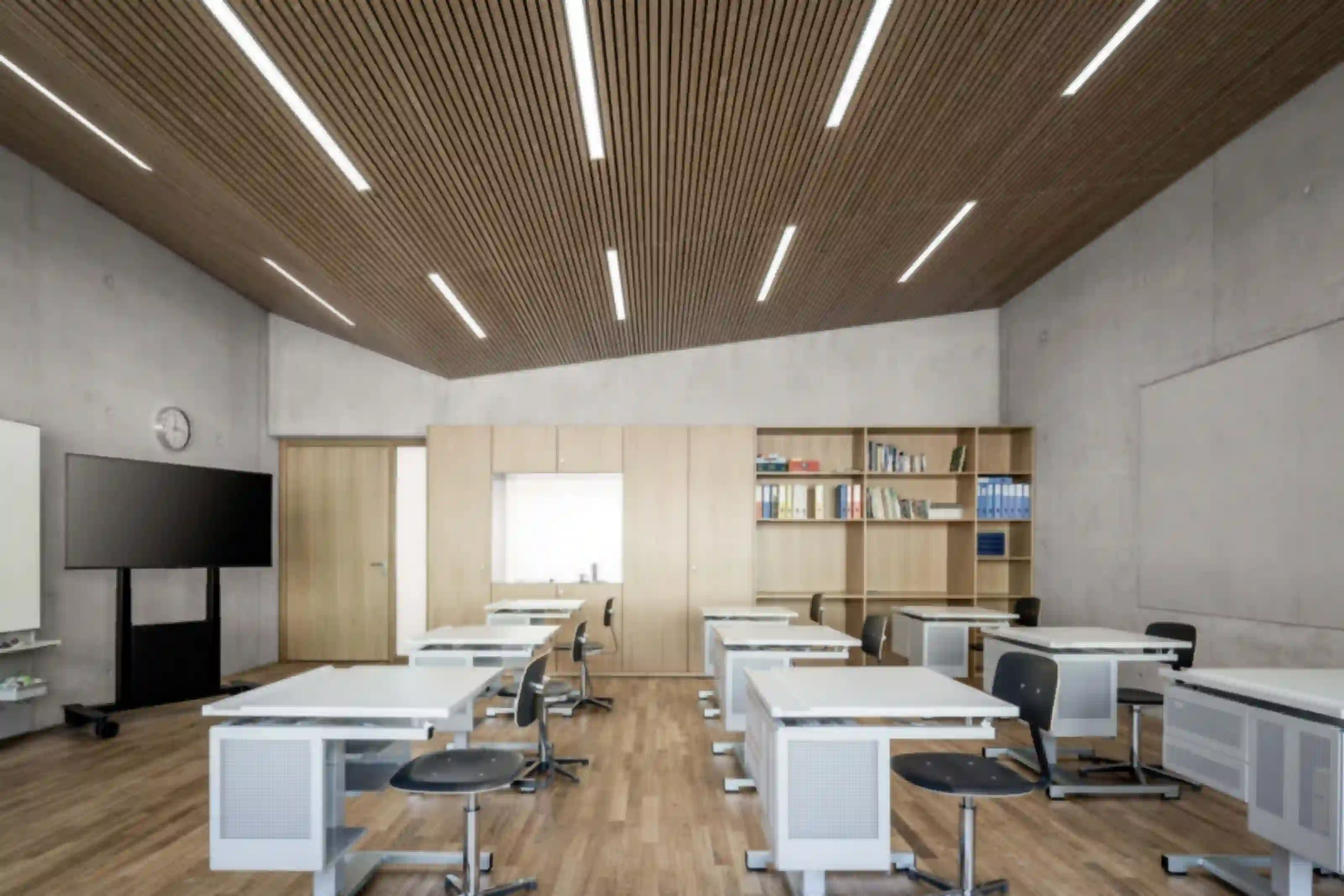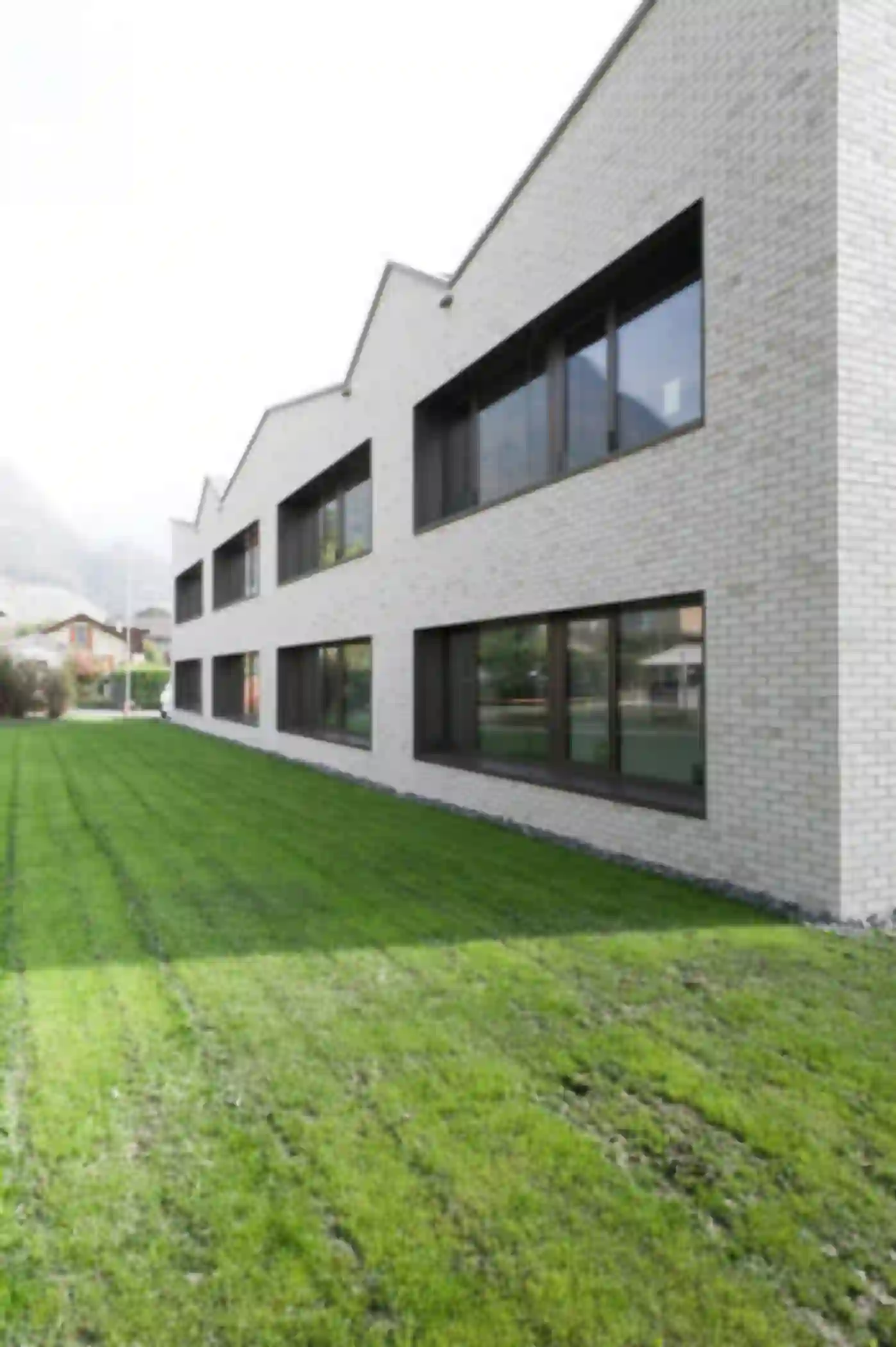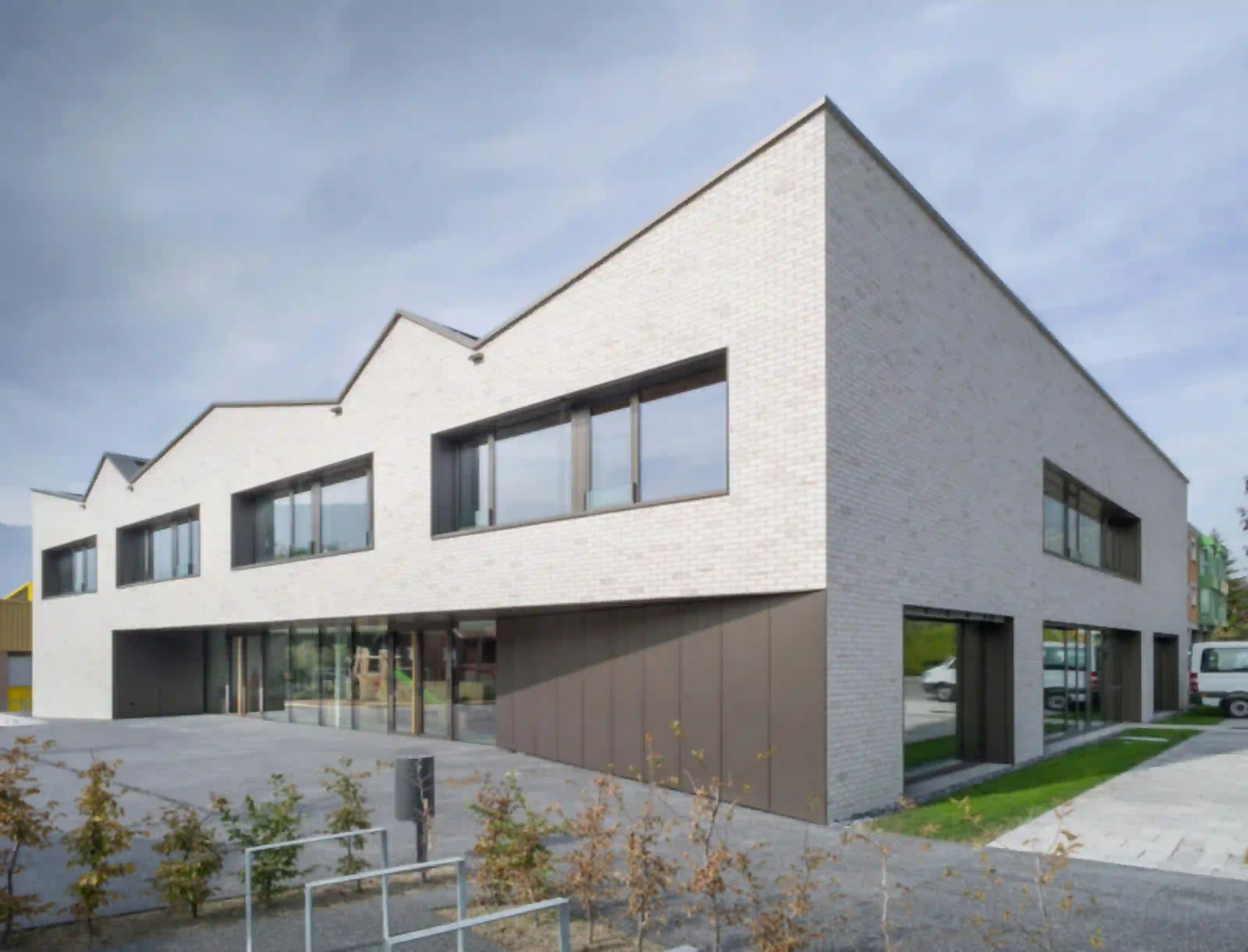 Der Neubau für die Fondation La Monneresse ist eine Förderschule für schwer erziehbare Kinder. Die Schule gliedert sich typologisch in zwei Teile – den Sockel mit übergeordneten Funktionen wie Verwaltung, Speiseraum und Eingangsbereich, und dem Klassentrakt im Obergeschoss. Man betritt das Gebäude zentral über ein Foyer mit Garderobe, von wo aus zwei Treppen zu den Unterrichtsbereichen führen. Dort umfassen je vier Klassen einen gemeinsamen Lerncluster. Die so entstehenden Raumeinheiten ermöglichen vielfältige Unterrichtskonfigurationen vom klassischen Frontalunterricht bis hin zu klassenübergreifendem Projektunterricht. Als Herzstück und von allen Klassenzimmern aus einsehbar lädt eine lichtdurchflutete Bibliothek zum Lesen und Stöbern ein. Eindeutiges Wiedererkennungszeichen des neuen Schulhauses ist sein mehrfach gefaltetes Dach. Gemeinsam mit einer klaren Materialisierung und Lichtführung verleiht es der Förderschule eine eigenständige Note.